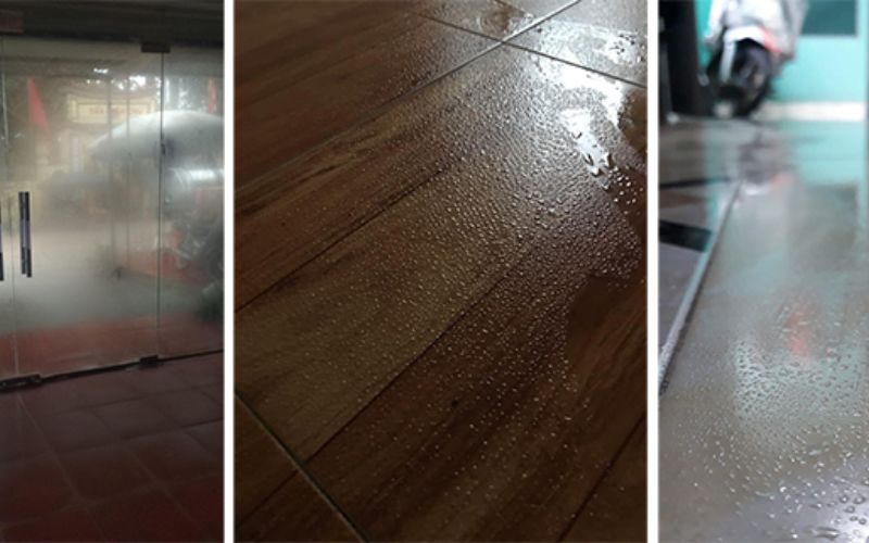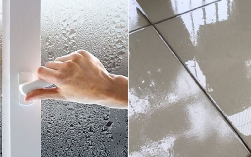 Đây là dấu hiệu dễ nhận biết nhất khi trời nồm ẩm xuất hiện. Bạn sẽ thấy bề mặt sàn nhà trở nên ướt như có nước đổ, thậm chí trơn trượt và dễ gây té ngã. Không chỉ sàn, tường, kính và các bề mặt nhẵn cũng xuất hiện lớp hơi nước li ti hoặc đọng thành giọt. Nguyên nhân là do hơi ẩm trong không khí gặp bề mặt lạnh nên bị ngưng tụ lại. Nếu tình trạng này kéo dài, không chỉ gây bất tiện trong sinh hoạt mà còn làm tăng nguy cơ nấm mốc và hư hỏng đồ nội thất.